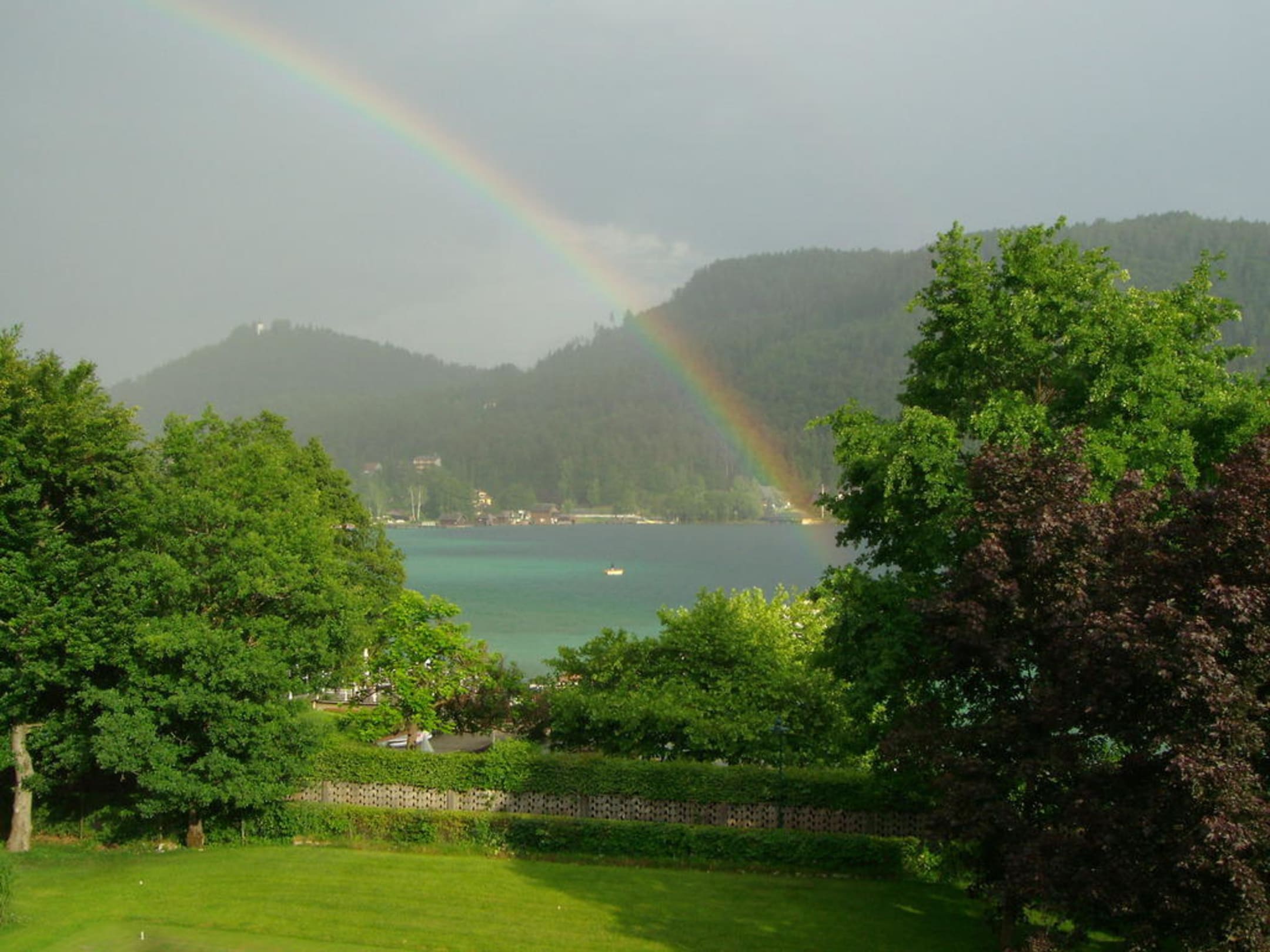 Blick aus dem Hotelfenster des Haupthauses auf die Hotelgartenanlage und den Klopeiner See mit dahinter liegenden Bergen und einen Regenbogen