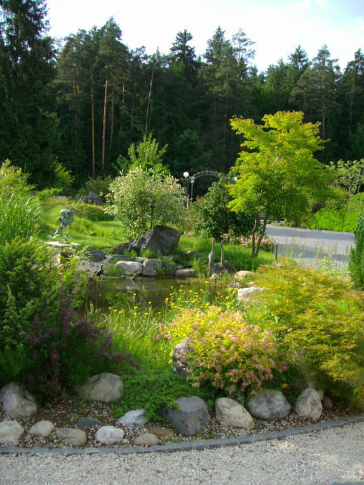 Abwechslungsreich und geschmackvoll ausgestaltete Vorgartenanlage vor dem Hoteleingang Amerika-Holzer mit Fisch-Teichanlage und Skulpturen