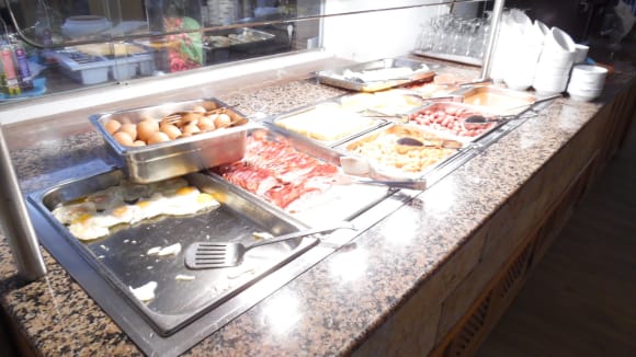 Warmes Buffet (Morgenbuffet) mit Speck, Würstchen und Spiegeleiern