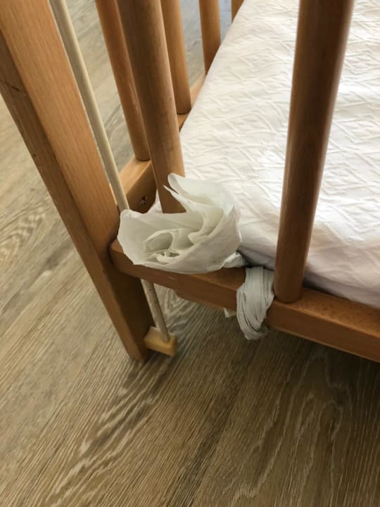 Babybettmatratze mit Toilettenpapier befestigt