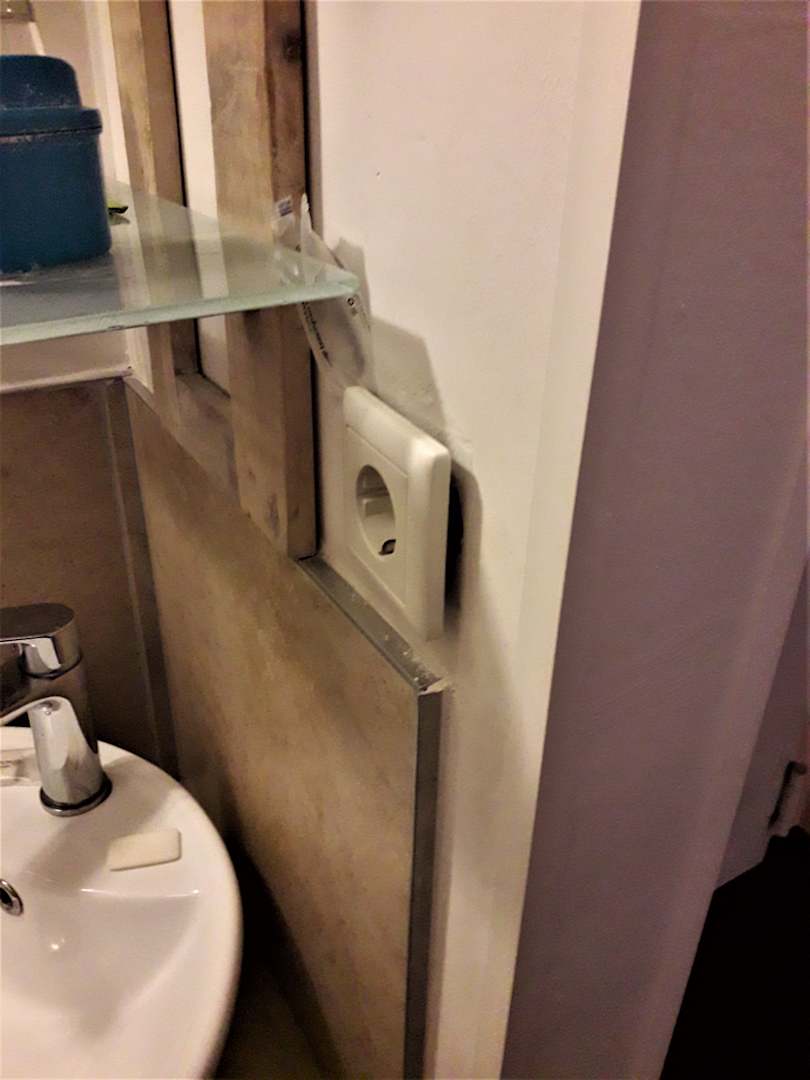 ZimmerSteckdose im Badezimmer hängt z. T. aus der Wand... und das direkt über den Waschbecken.