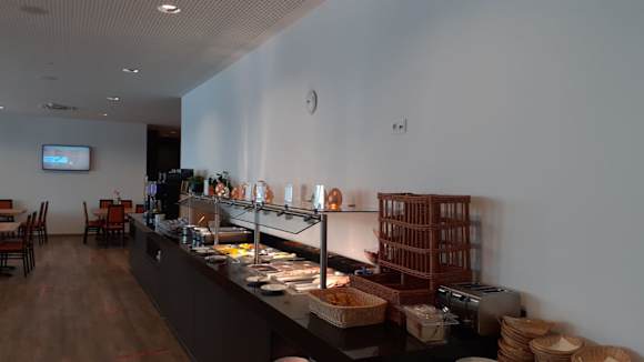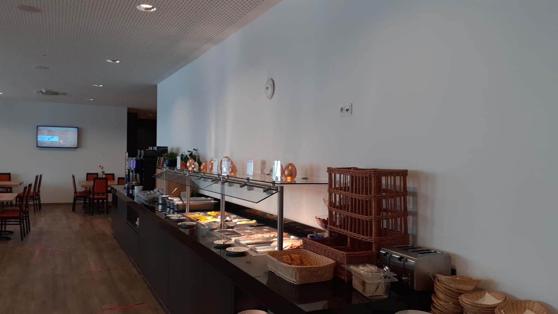 Blick aufs Büffet, die verbliebenen Bachwaren (einige Minicrossants und Toast) im Vordergrund