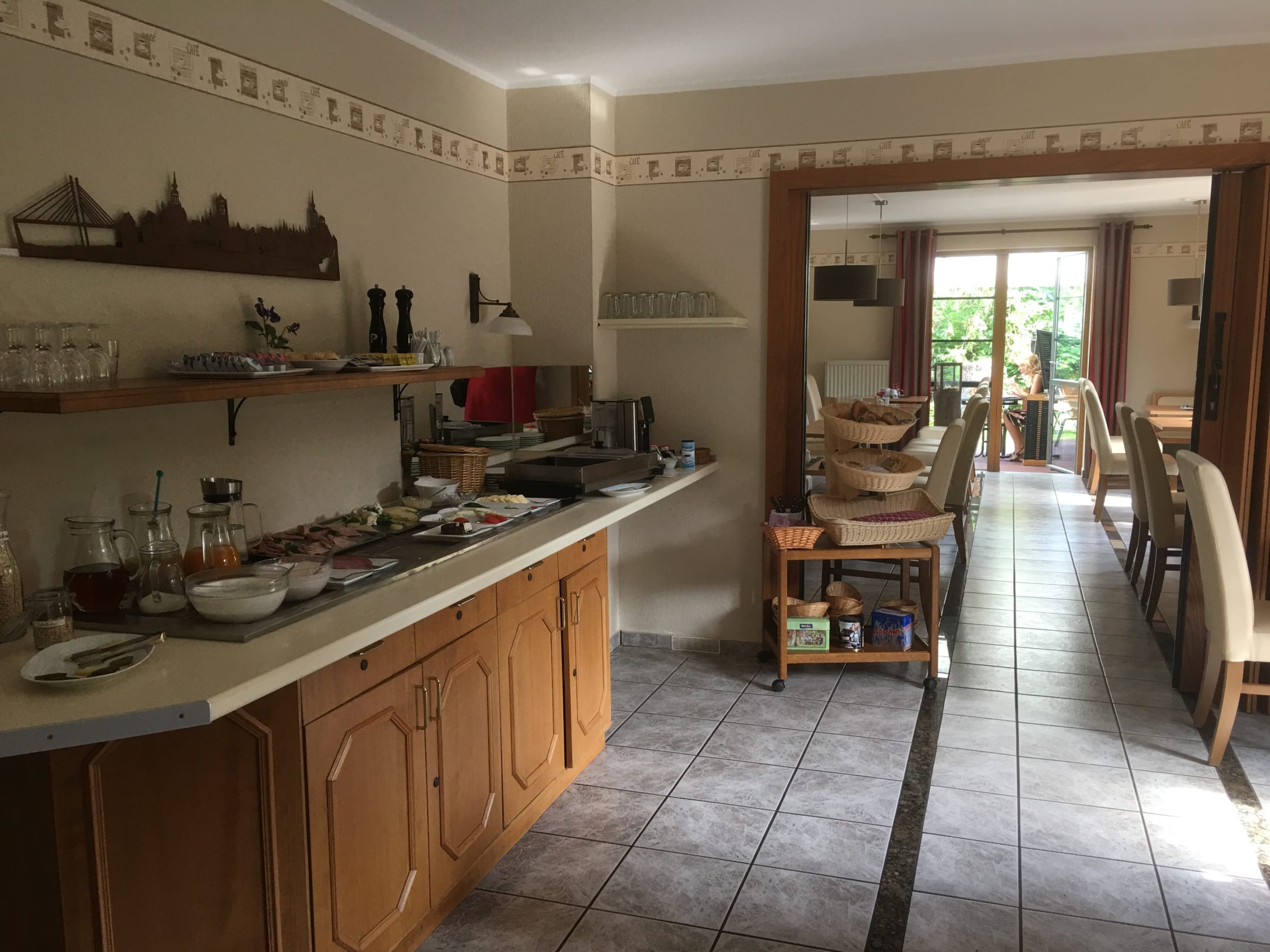 Frühstücksbuffet, Frühstücksraum mit Ausgang zum Garten