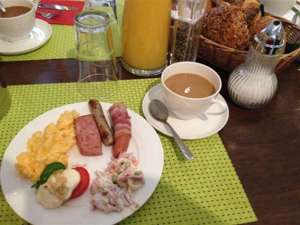 Rührei, Wurst mit Speck, Wurststalat zum Frühstück