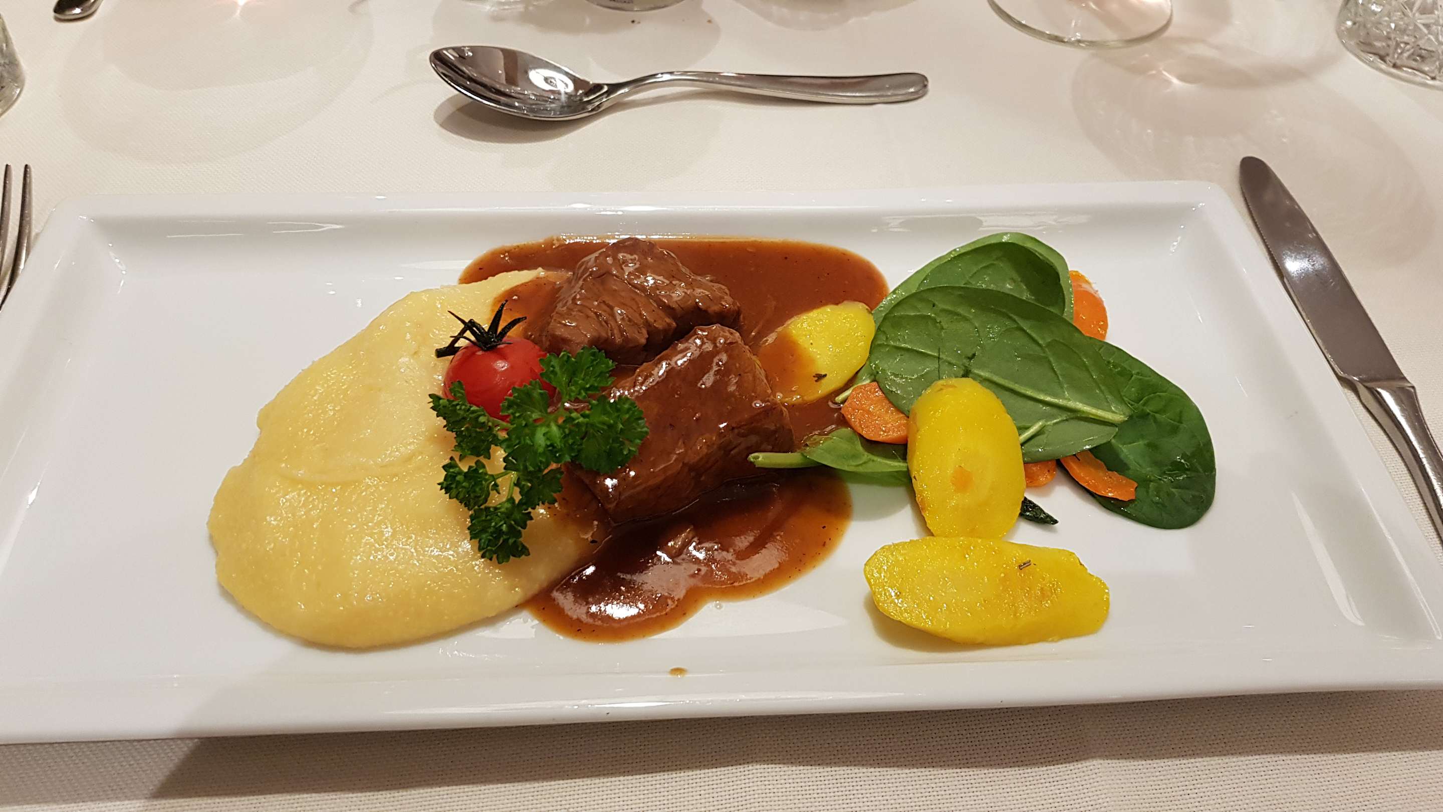 Leckere Hauptspeise - Rindsgulasch mit Polenta auf frischen Blattspinat