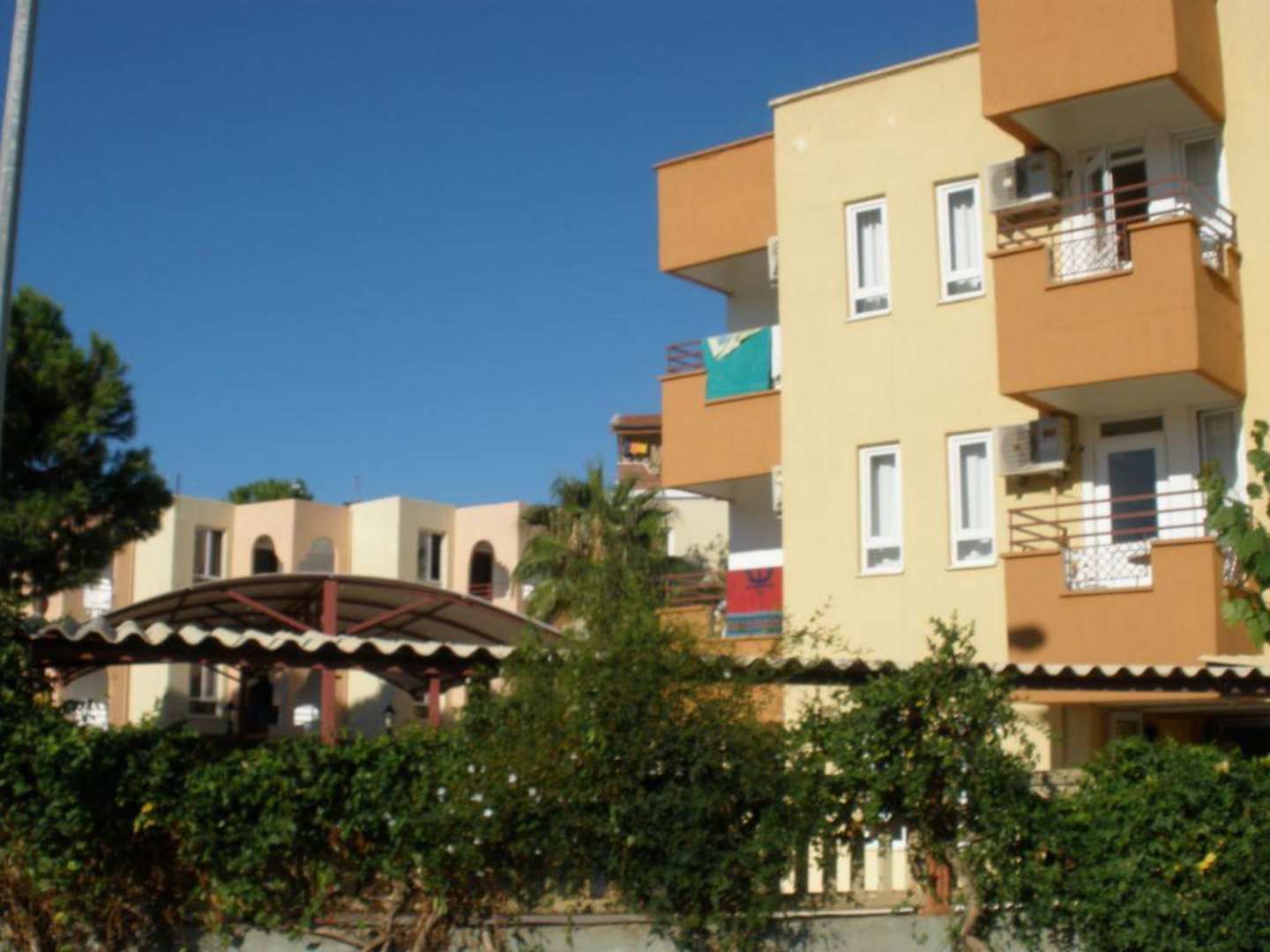 Aussenansicht des Hotel Angora vor dem Eingangsbereich. Das Hotel besteht aus mehreren Blöcken wie man auf dem Bild sehen kann.