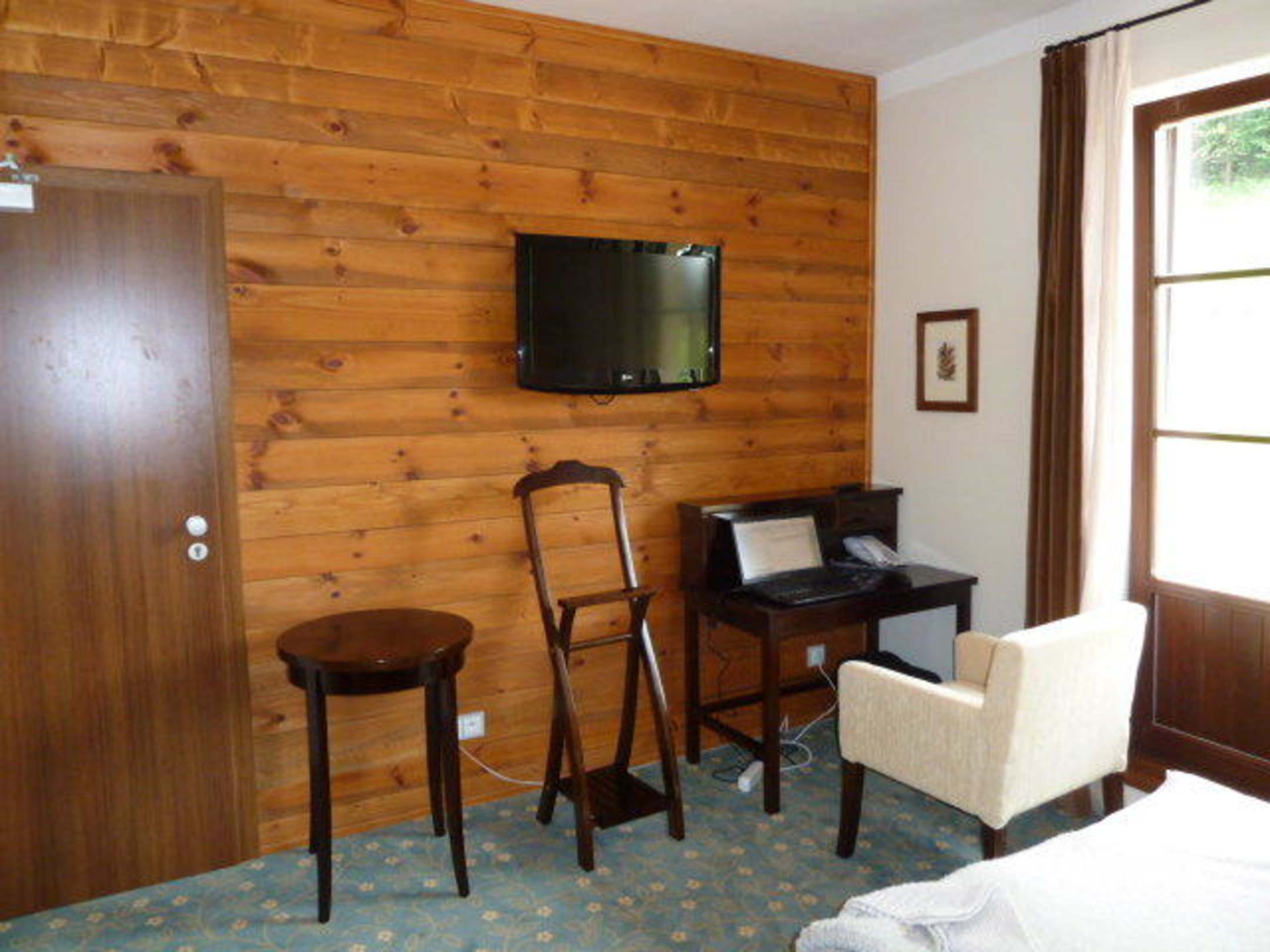 Hotel Annin Zimmer 110Schreibtisch mit Sessel, Beistelltisch, Kleiderdiener und Flachbild-TV des Zimmer 110 im Erdgeschoss
