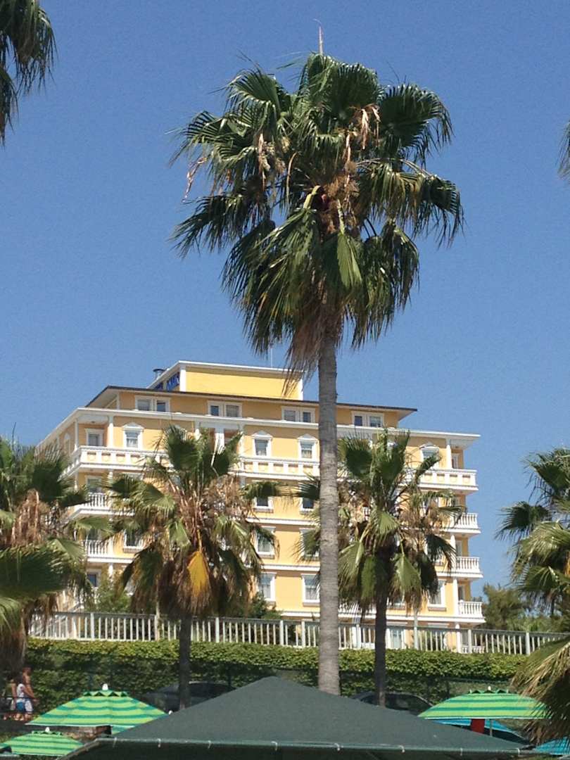 Blick vom Strand zum Hotel.