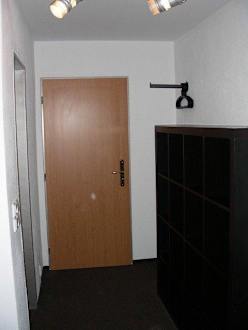 Blick von Fenster zu Tür. rechts: offenes Regal mit Ablageflächen(neu)
