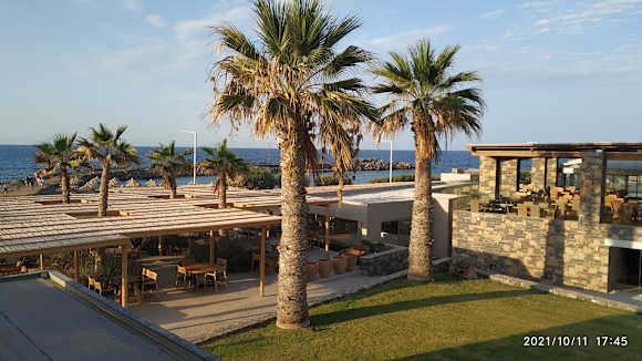 Außenansichtvom Nebengebäude Richtung Meer links Strandbar - rechts große Außenterrasse des Restaurants
