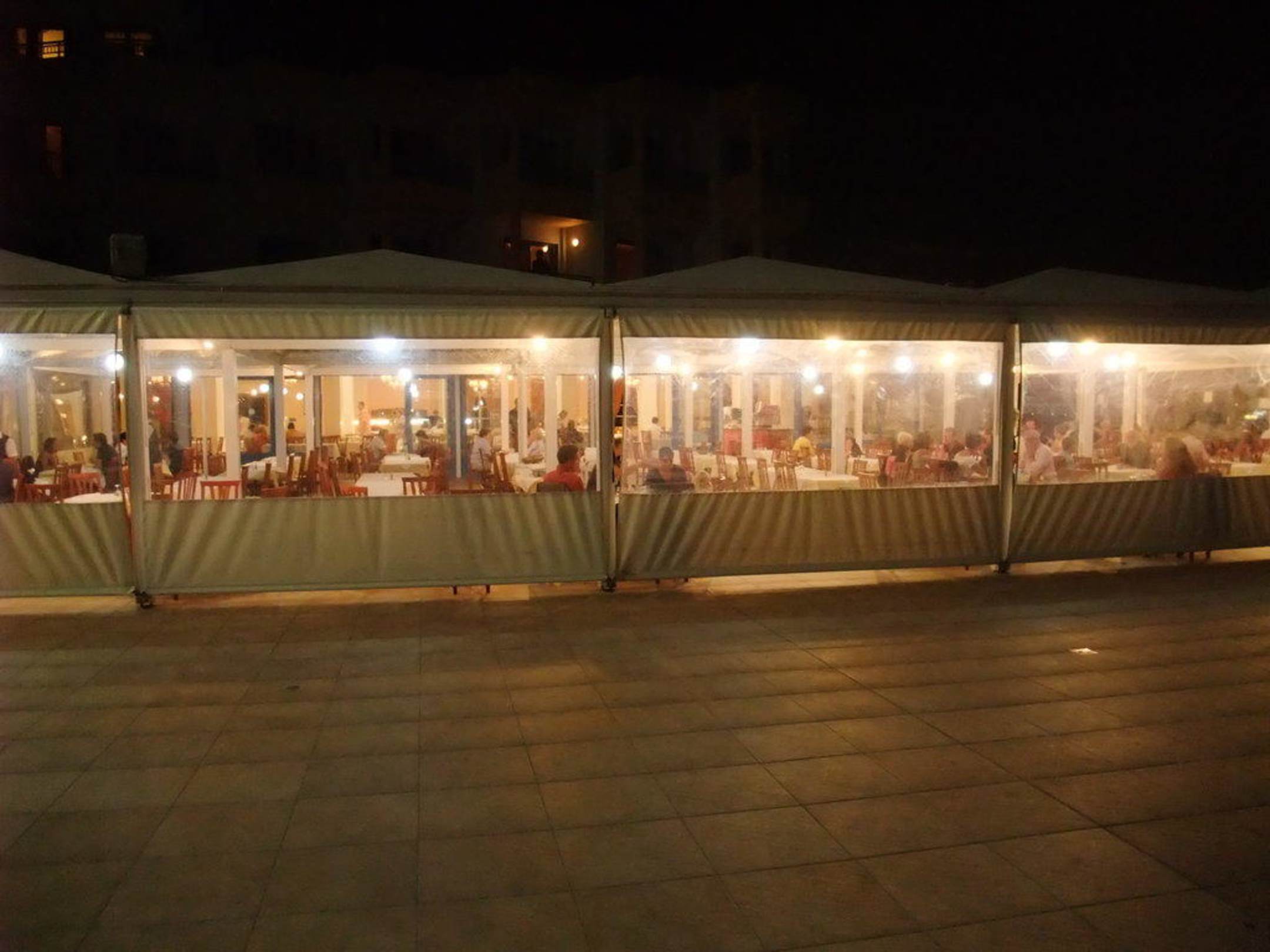 Ausblick vom Pool auf äußeren Restaurantbereich. Windschutz heruntergelassen.