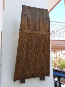 Hotel Apollon - DokaniBei dem im Außenbereich des Hotels befestigten Dokani handelt es sich um ein Dreschwerkzeug. Diese wurden noch bis in die 70er Jahre in der Landwirtschaft eingesetzt. / Direkt neben dem Hotel Apollon befindet sich der "SuperMarket ATLANTIDA" ...
