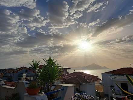 Blick von der Dachterrasse auf Berg Athos