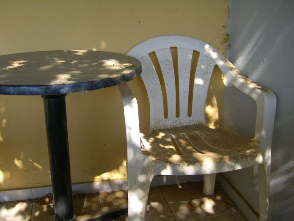 Sie sehen hier eine Aufnahme eines Balkons mit Gartenmöbeln des Hotels Aptera. Es ist deutlich zu sehen, dass die Möbel völlig verdreckt sind und keineswegs einem 3-Sterne-Hotel entsprechen.