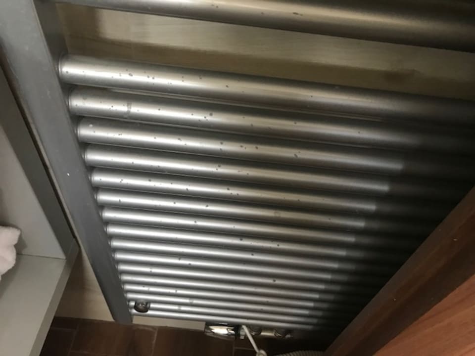 Komplett mit Dreck vollgespritzter Sprossenheizkörper.