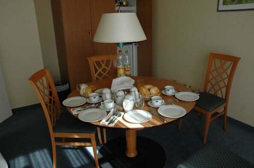 FrühstückstischFrühstück im Esszimmer eines 3-Raum Appartements. Gegen Aufpreis von 3 Euro wird das Essen aufs Zimmer serviert.