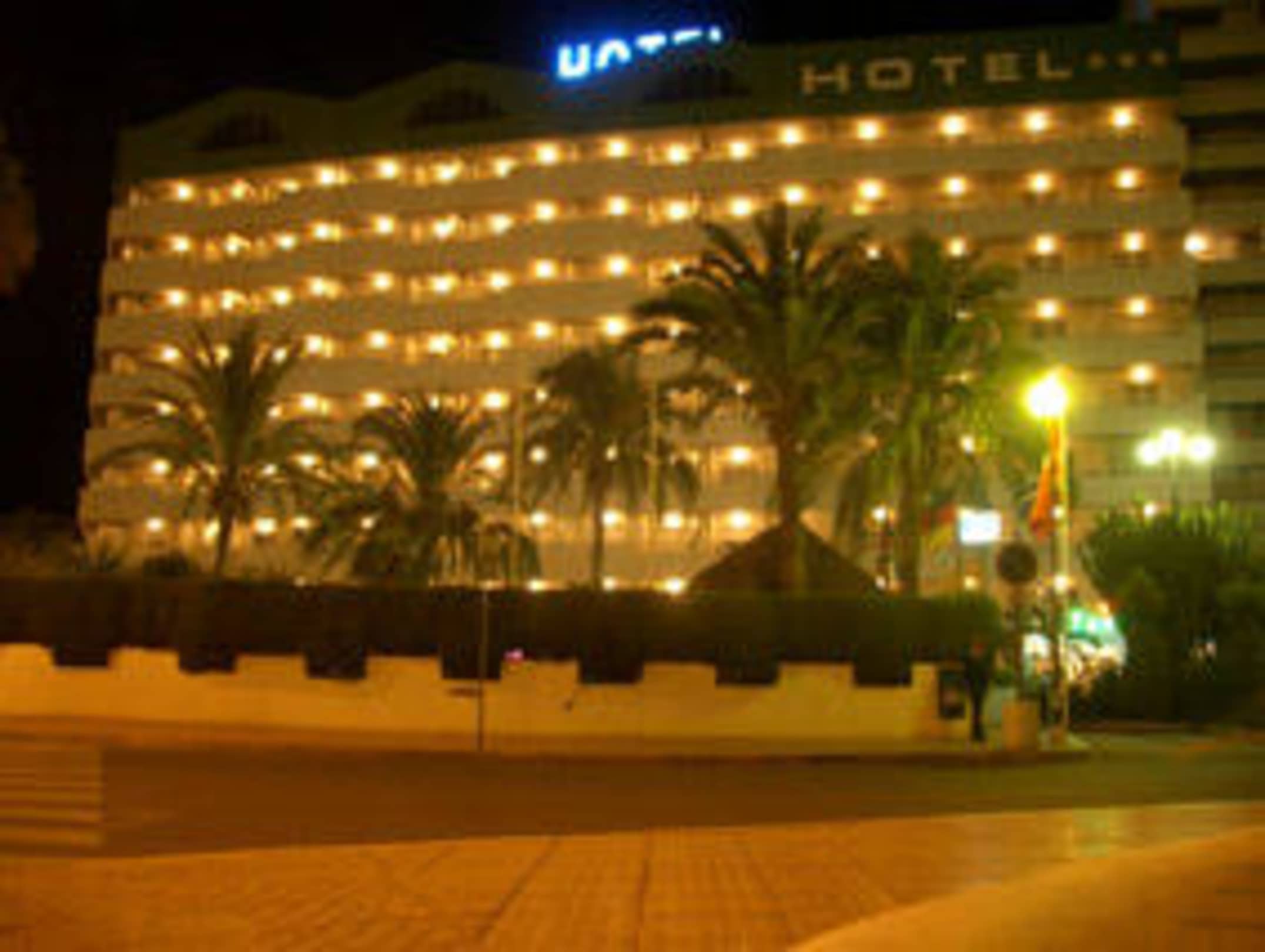 Hotel Esmeralda am AbendAbends waren auf allen Balkons (hier die Westseite / Eingang) die Lichter automatisch eingeschaltet.