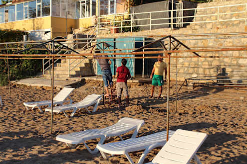 Während man die Sonne genossen hat, wurden die Pavillons am Strand, teilweise per Flex,. Abgebaut. Wir wurden mit dem Wort: „WEG“ aufgefordert, den Strandabschnitt zu räumen.