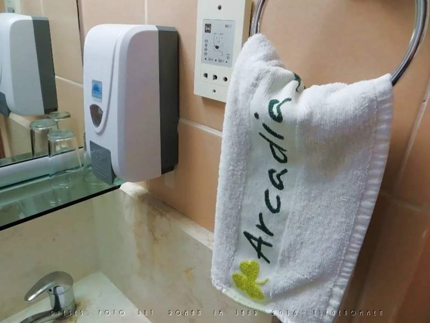 Detail Bad mit Flüssigseifenspender und Handtuch
