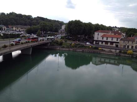 Links von der Brücke ist der Bahnhof