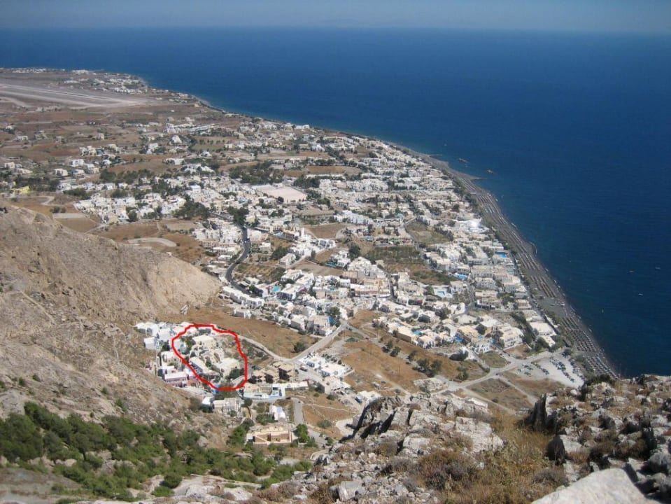 KamariDas ist der Blick über Kamari von Alt Thira aus. Das Hotel Argo habe ich rot eingekreist. Links oben erkennt man den Flughafen.