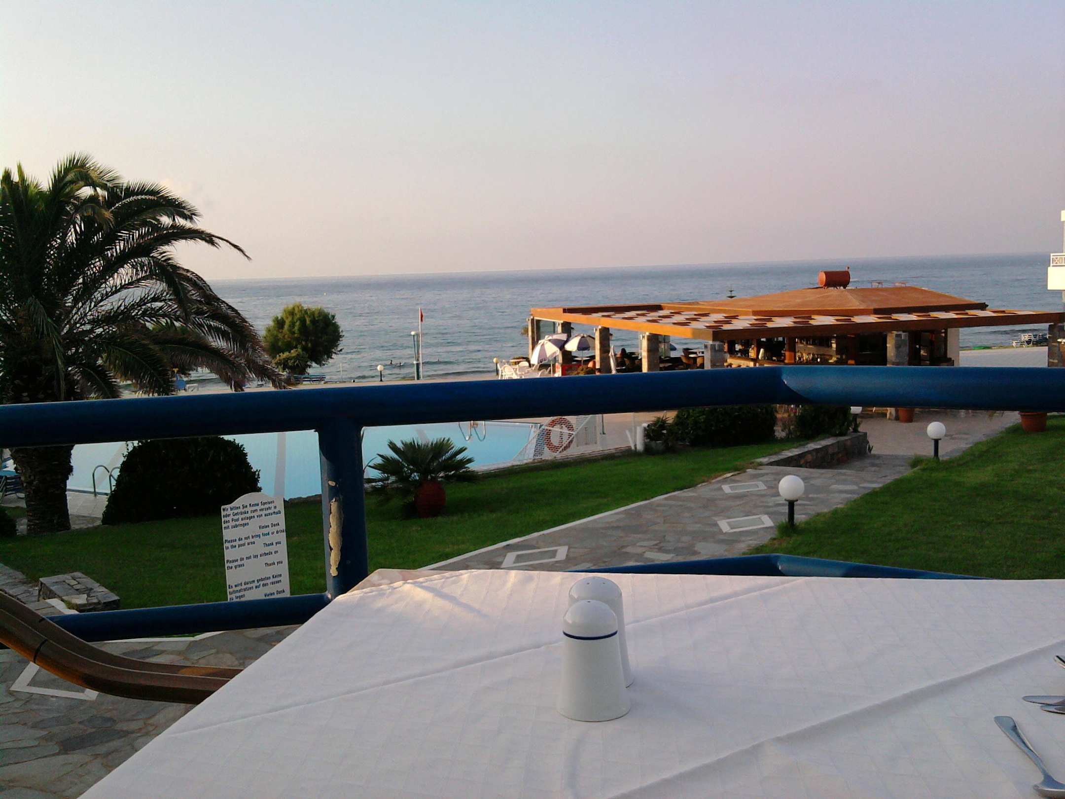 Blick über Garten und Pool zum Strand am Abend