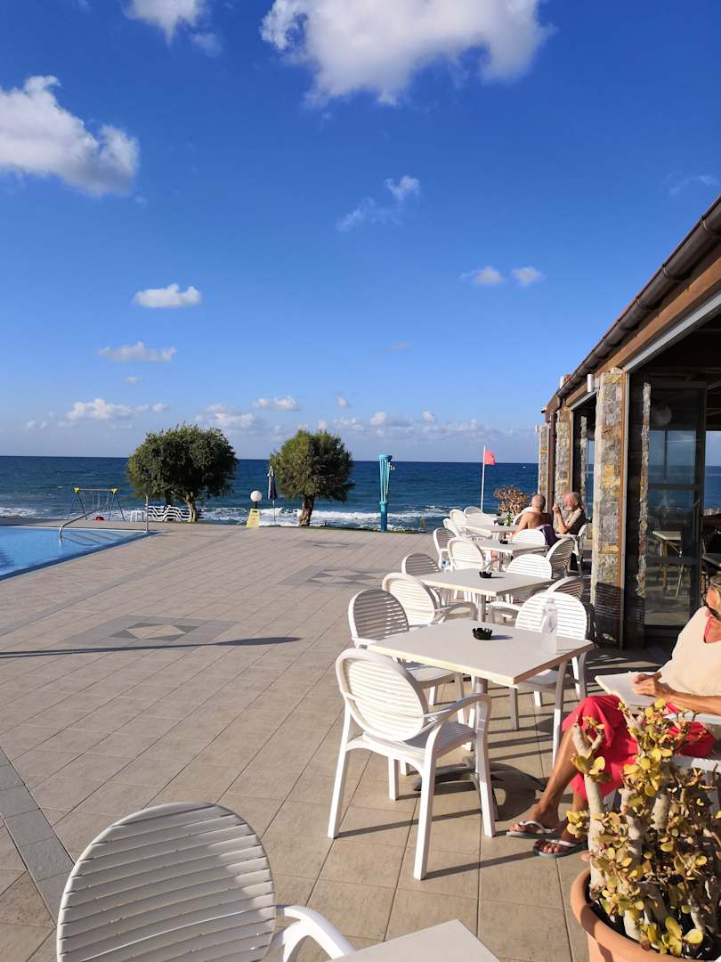 Blick von der Snackbar auf Pool und Meer