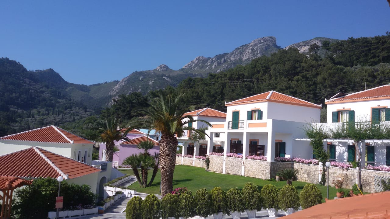 Blick von der Terrasse auf Nebengebäude und Berge