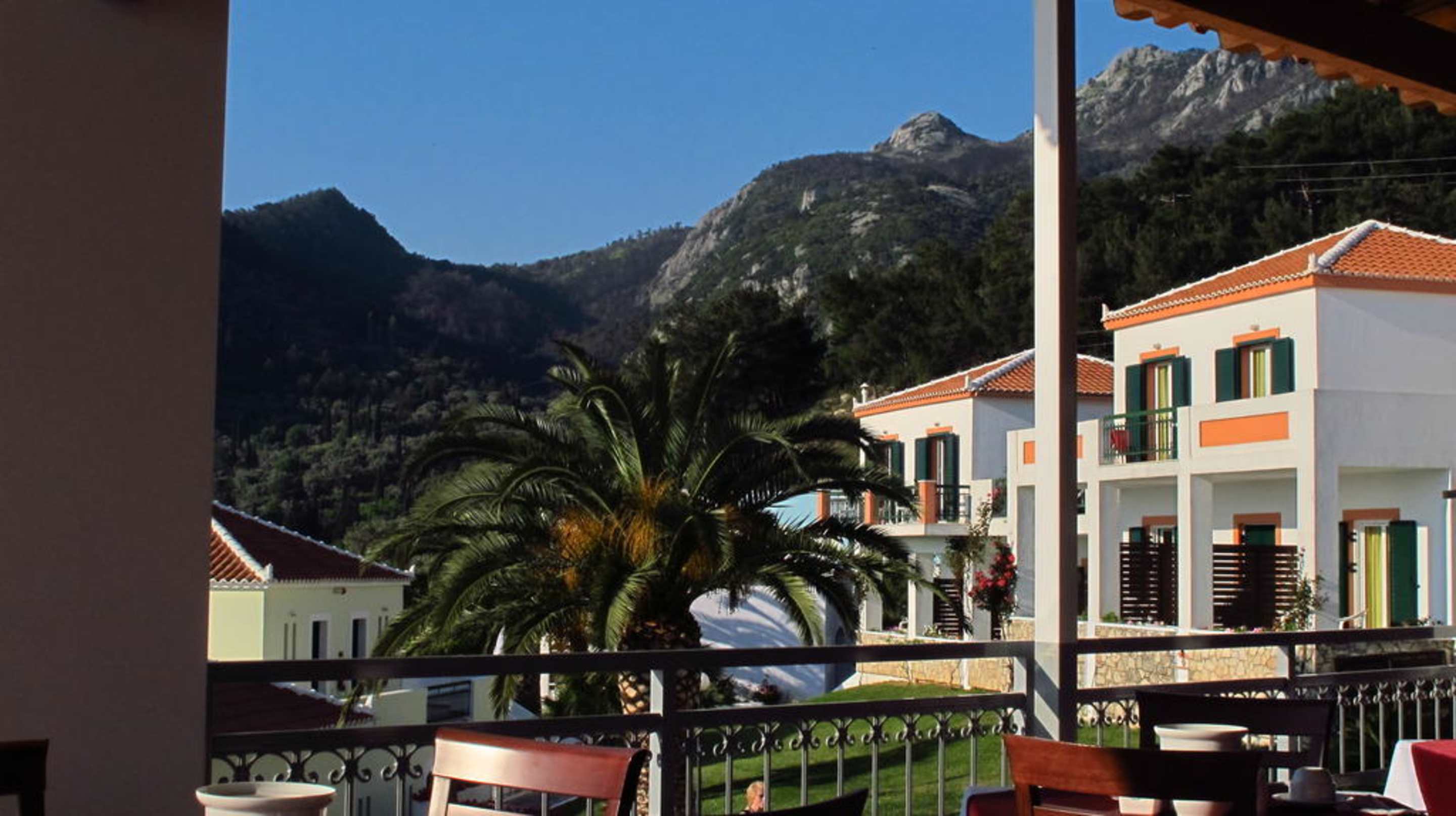 Bungalows vor dem AmbelosbergenBlick von der Frühstücksterasse zu den Bungalows im Hintergrund die Berge des Ambelosmassivs mit dem Louloudes Castle