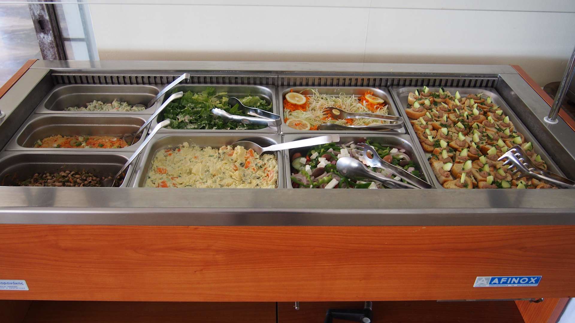 Leckeres Salatbüffet. Griechischer Salat, Krautsalat, Lattichsalat, Griechischer Kartoffelsalat, Augenbohnensalat, Hummusceme, Reissalat und ostinis mit einer Räucheraal-Thunfischpaste ( Von Yannis selbst gefangen und hergestellt).