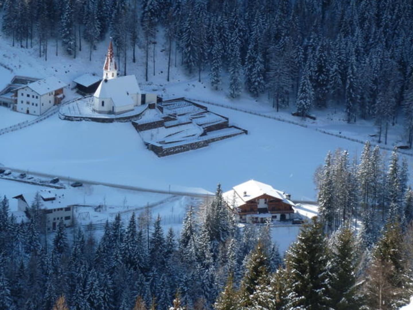Hotel im Vordergrund zwischen den Tannen. 2. Jan.2012