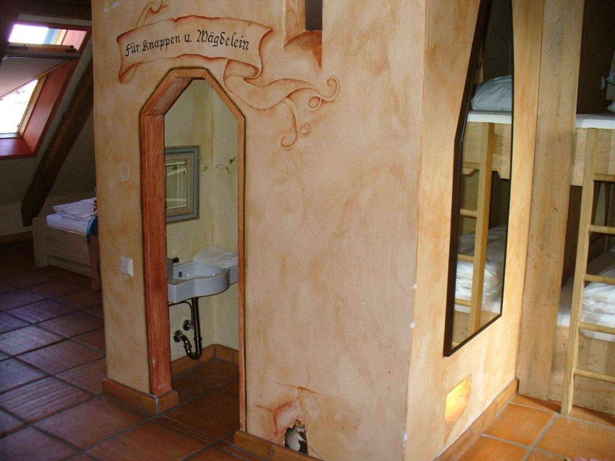 Themenzimmer "Schwarzer Veri"kleine Toilette, Waschbecken und Spiegel in einem extra "Häuschen" im Familienzimmer für die kleinen Gäste
