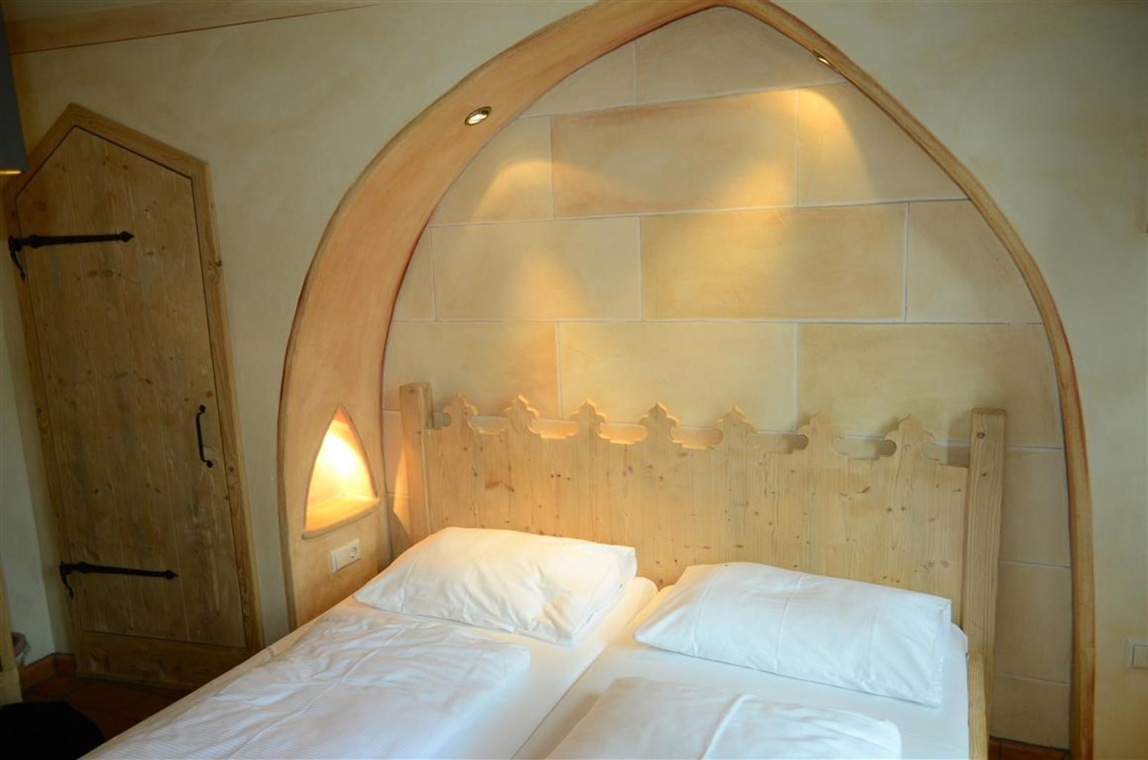 Das Doppelbett des Turmzimmers