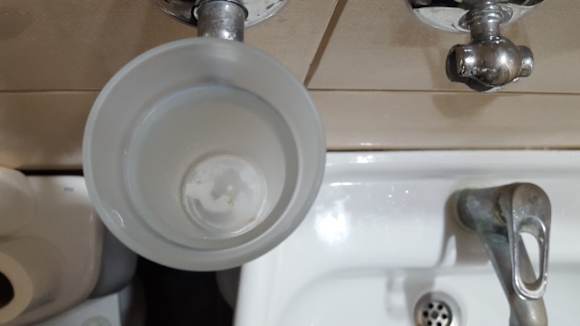 Im Glas im Badezimmer war eine dicke Schmutzschicht. Ekelig. Ist wohl schon lange nicht mehr gereinigt worden. Die Ablage daneben fehlte. Es hing nur noch die Befestigung an der Wand.