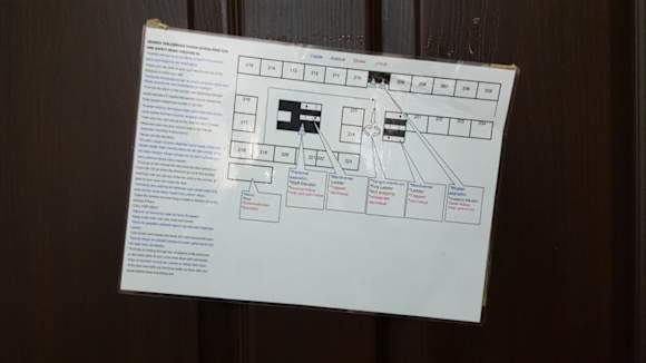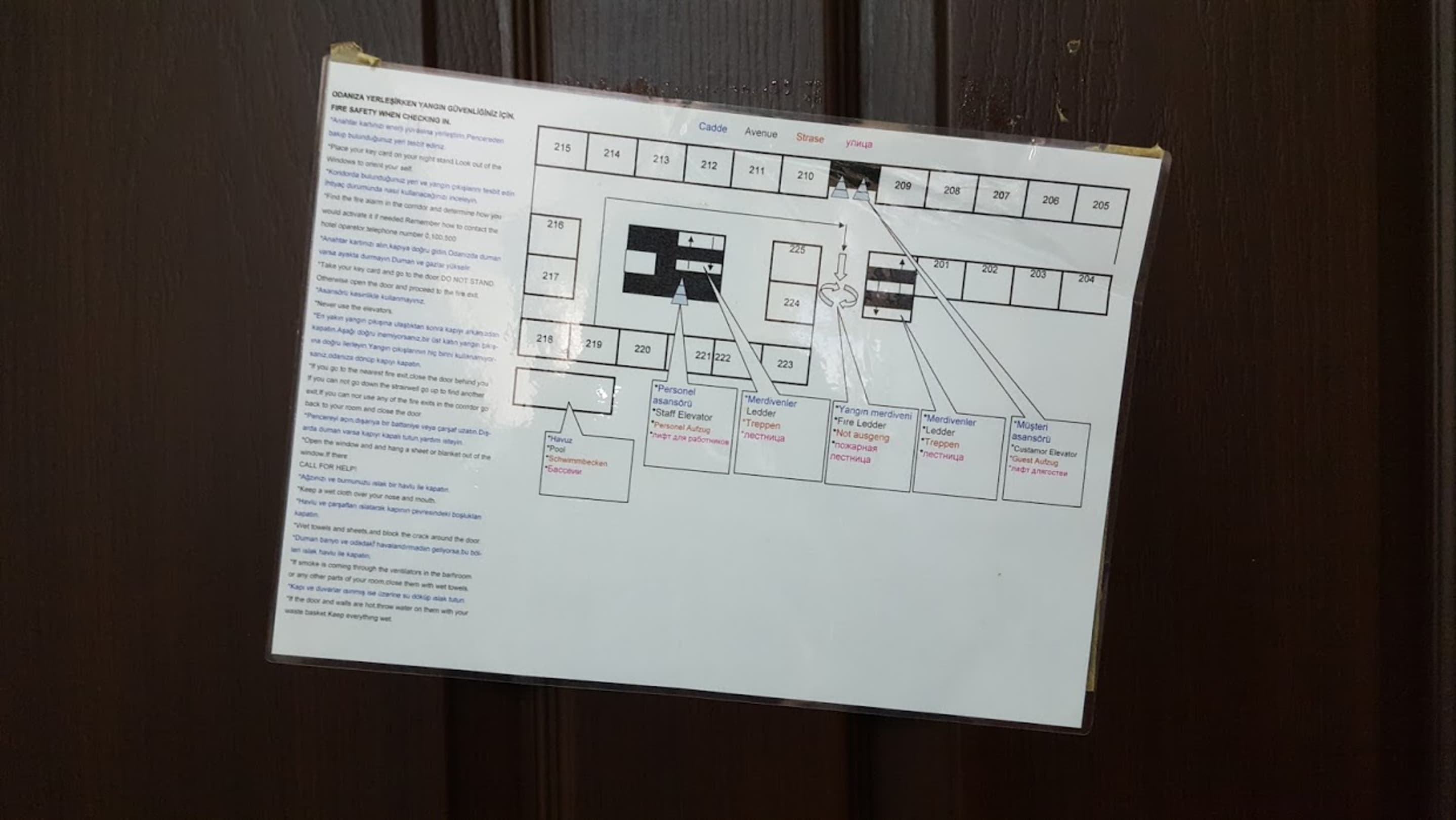 ZimmerFluchtplan an der Zimmertür. Notdürftig und schief an die Tür geklebt. Wobei die Tür mit Kleber-Resten verschmiert wurde.