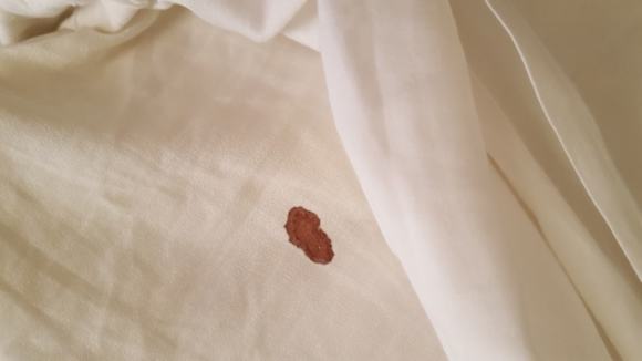 ZimmerKissen vom Bett. Bereits mit Blutfleck verschmutzt. Scheinbar ungewaschen.