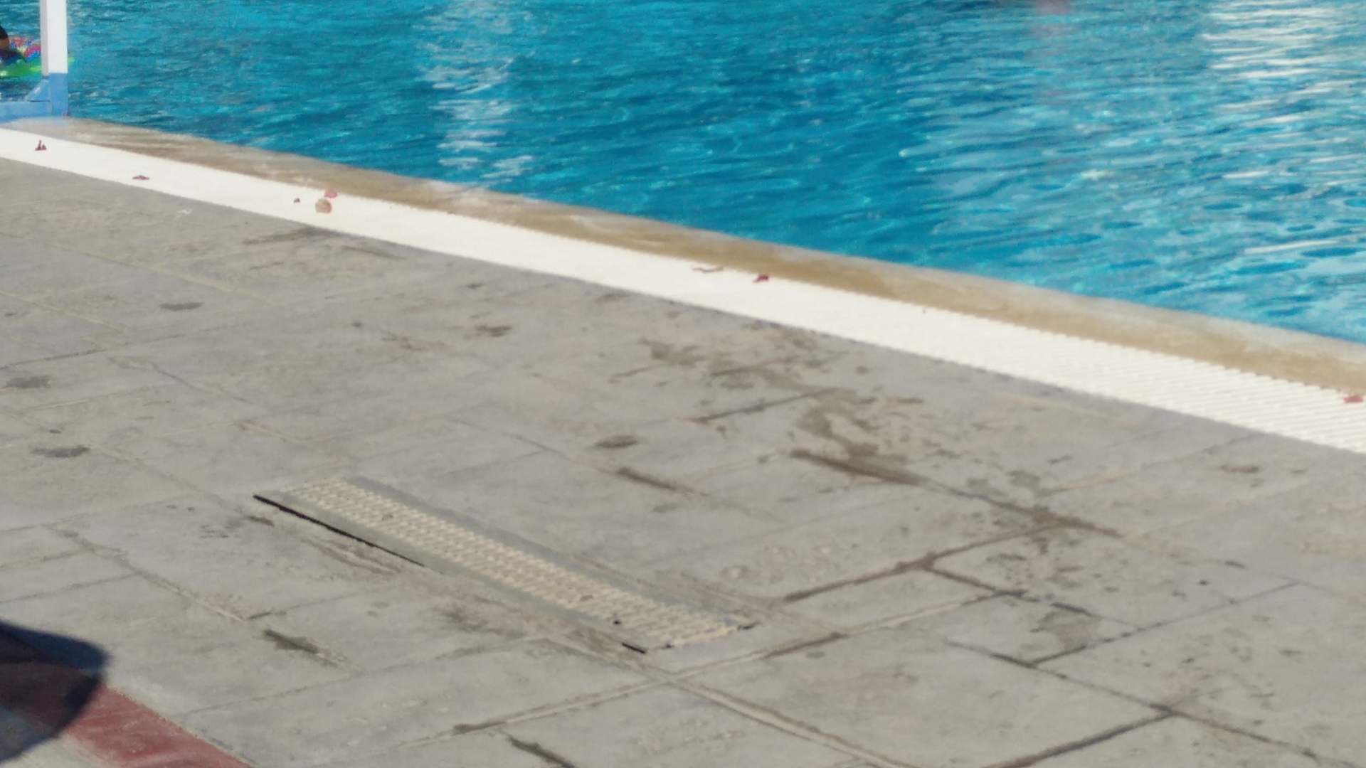 Gitte am Poolrand steht auf. Bloß nicht mit den Zehen dran stossen.