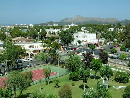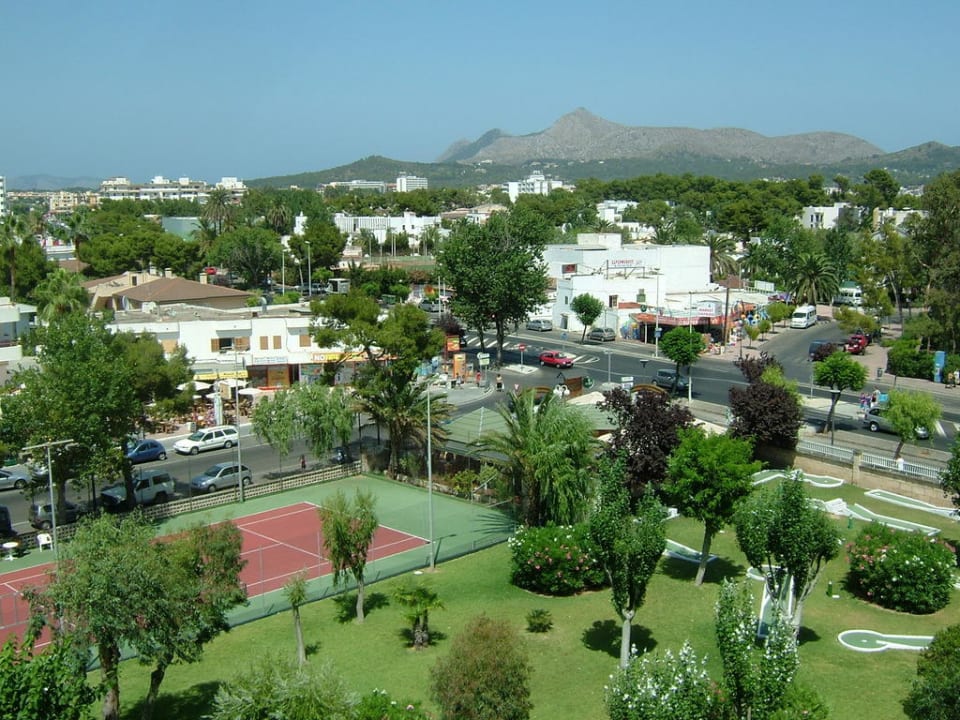 Die Aussicht aus unserem Zimmer auf die Minigolfanlage,den Tennisplatz und die Straße...