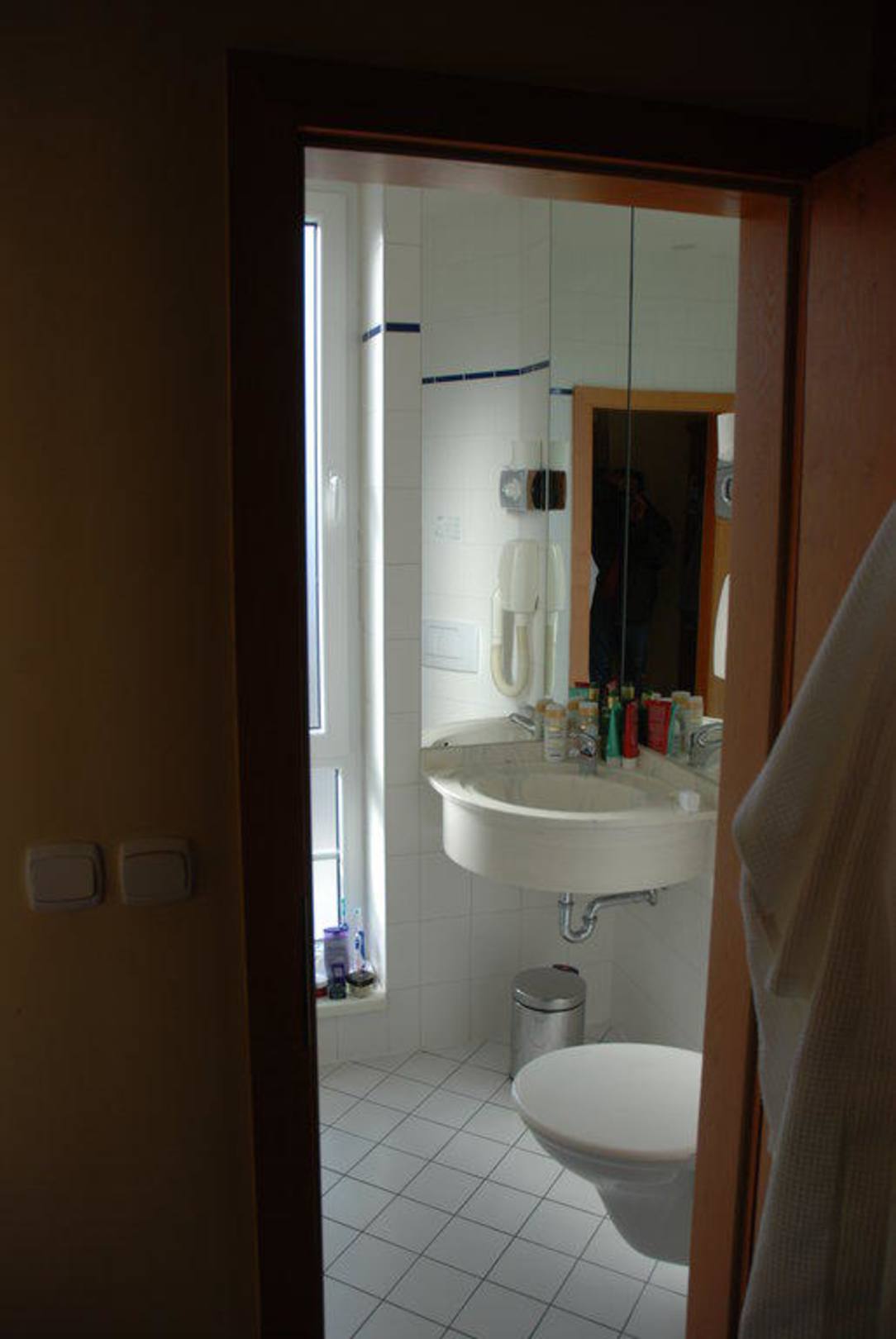 Das Badezimmer ist recht klein. Viel Platz für den Inhalt eine Beauty case gibt es nicht. Eine Badewanne mit Dusche befindet sich links hinter der Tür.