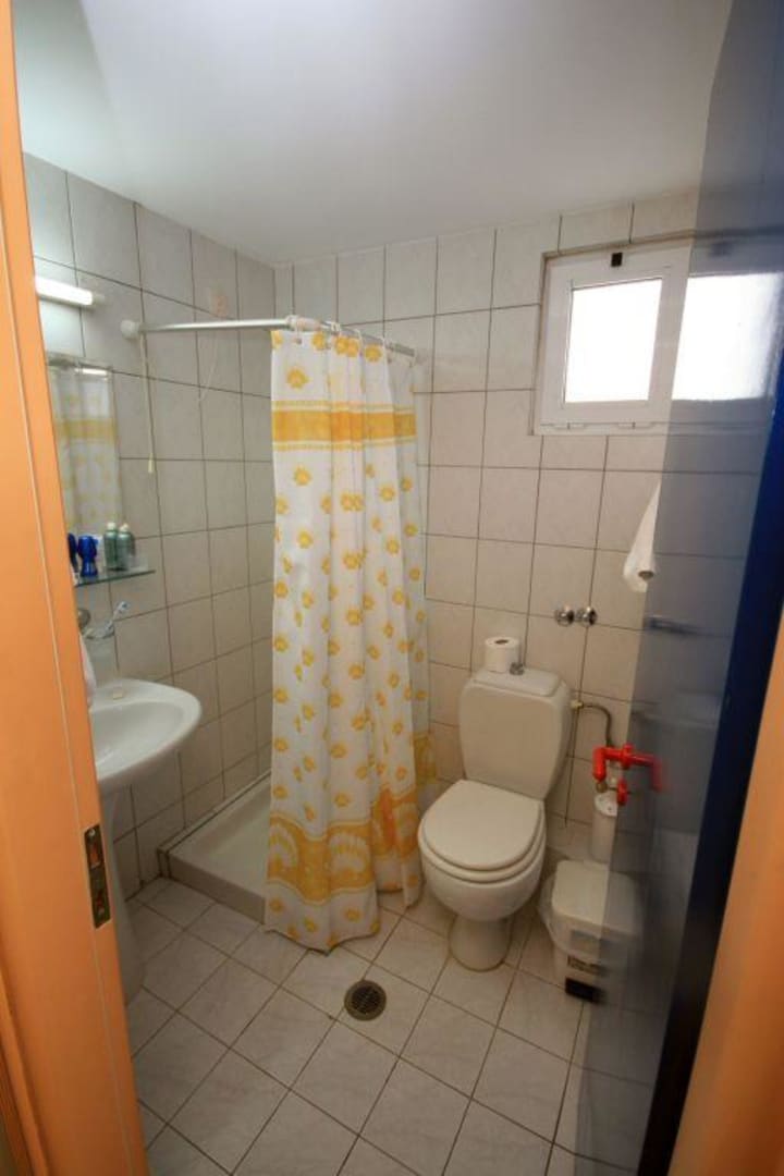 Bemerkenswert: ein sehr sauberer Duschvorhang - leider steht das Bad trotzdem unter Wasser.