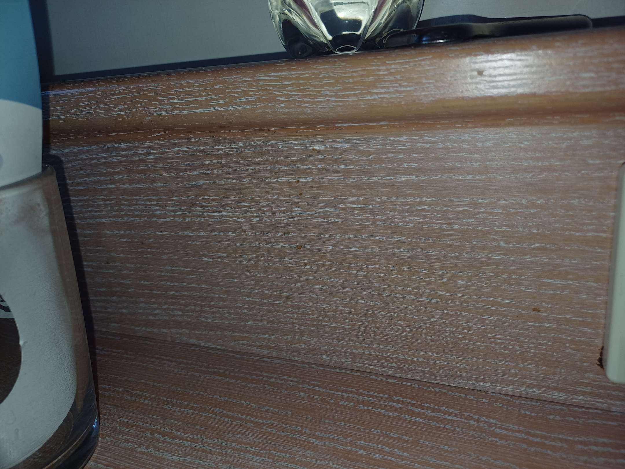 An der Tischleiste klebrige Reste irgendeiner Flüssigkeit des Vorgastes