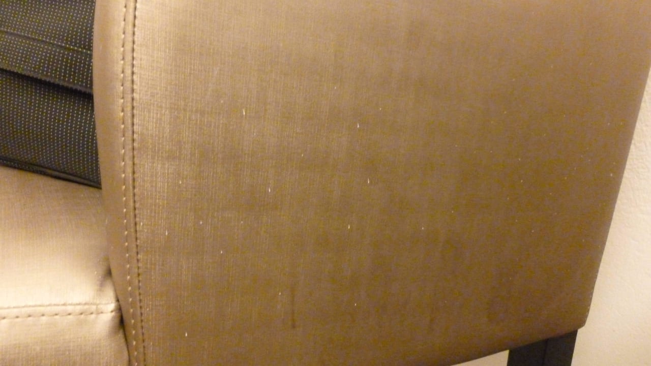 Sieht man schlecht auf dem Foto, aber der ganze Sessel klebte, ist sicher mal was süßes zum trinken umgeschüttet worden und die Putzfrau wischt die nie ab.