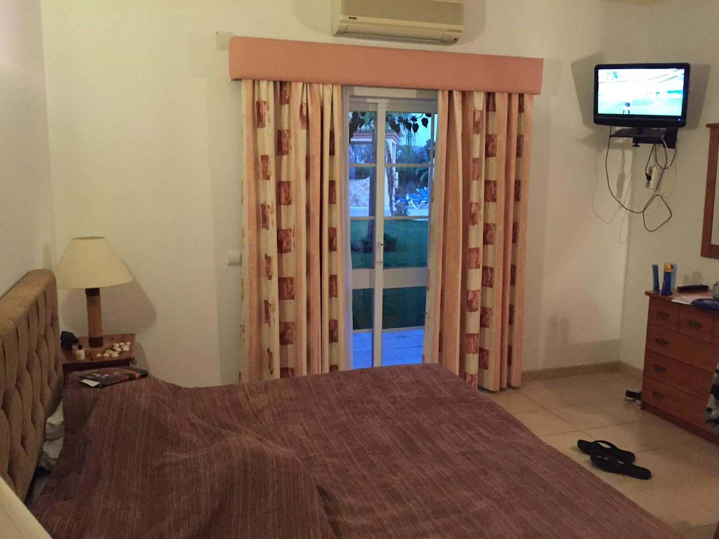 Blick über das Bett zur Terrasse