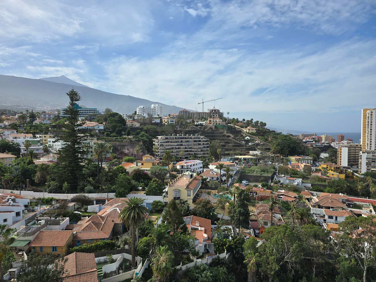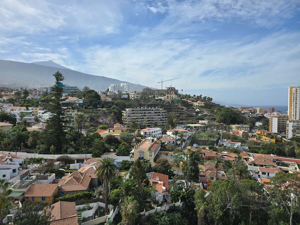 Blick von der Bar auf dem Dach des Hotel El Tope nach Puerto de la Cruz und zum Teide. Der hohe Baum nahe dem linken Bildrand steht in der Gartenanlage "Sitio Litre".