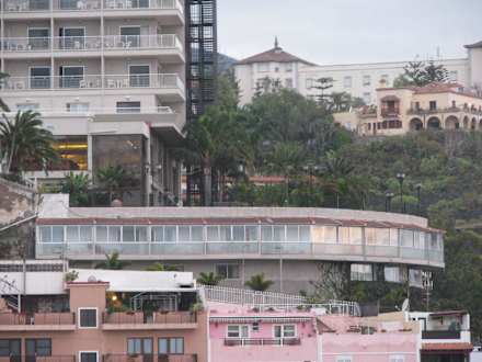 Untergeschosshinter dem weißen Zaun über dem rosa Gebäude verläuft die Straße, direkt unter den Zimmern des Untergeschosses