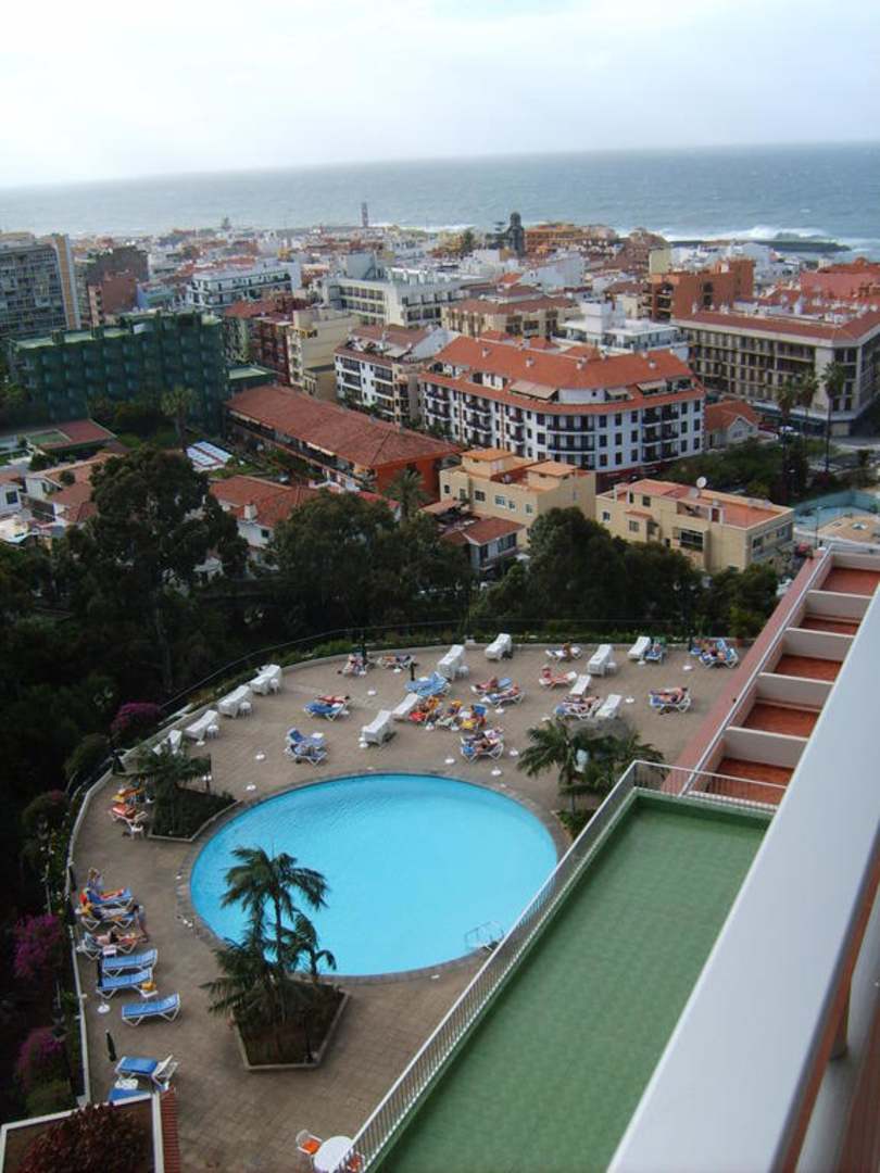 Blick auf den Pool - die Stadt - das Meer im Hintergrund
