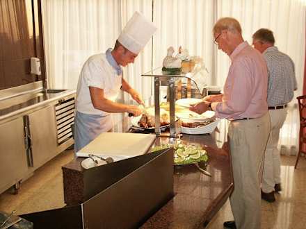 Freundlicher und hilfsbereiter KochFreundlicher und hilfsbereiter Koch beim Zuschneiden von Fleisch, Fisch etc.