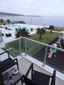 Widok z okna na basen plac zabaw i port