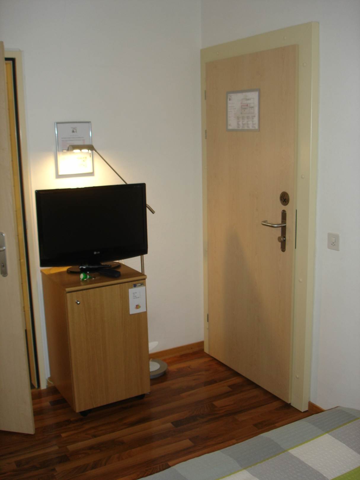 Blick auf TV und Minibar, rechts die Zimmertür. Vorteil: Kein Teppichboden sondern Parkett!