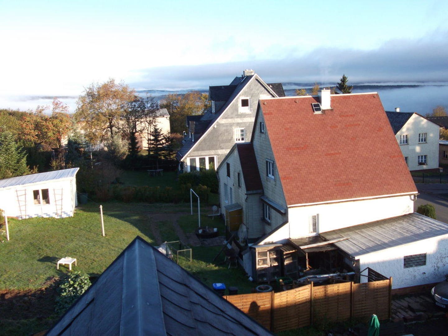 Blick vom Hotelüber den Hinterhof und den Thüringer Wald